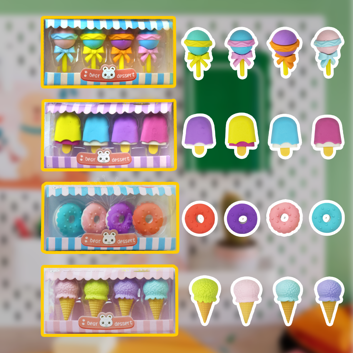 Este set de 4 paquetes de goma borrador en forma de helados Palate Dona Kawaii 3D es perfecto para los amantes de la papelería creativa. Con su diseño adorable y colorido, estos borradores añadirán un toque de diversión a tus tareas diarias.