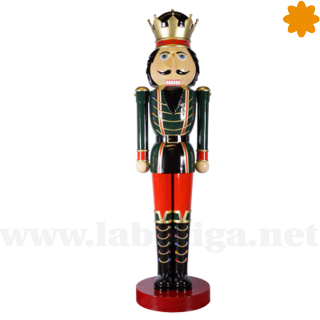 Ésta figura gigante del Cascanueces tiene una estatura colosal de 93 x 367.03 x 116 cm. Está hecha de resina poliéster. Combina los colores negro, dorado, verde, rojo y granate. Podemos observar como tiene todos los detalles del muñeco del cascanueces. Seria idóneo para un gran salón o para cualquier tipo de entrada de teatro o recinto de conciertos de música clásica.