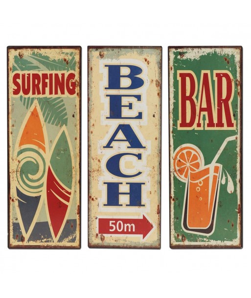 Conjunto de tres placas de metal con temática surfera con una medida de 13 x 33 cm cada una. Con los bordes desgastados simula la temática vintage con fondos blancos y verdes con letras de color rojo y azul. Cada placa de metal lleva los agujeros para colgar en la pared.