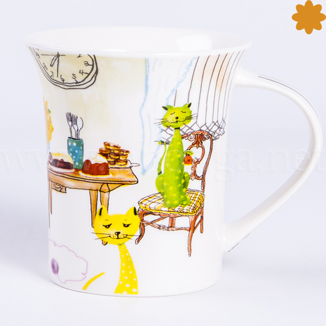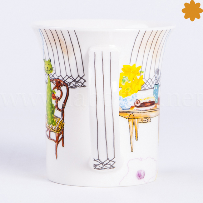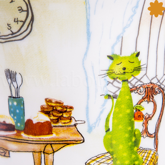 Esta taza mide aproximadamente 7 cm de diámetro por 11 cm de altura y tiene una gran asa que va desde la parte superior hasta la parte inferior, donde casi puedes colocar la mano entera, eso sí dependiendo del tamaño de tu mano, hejem!  Esta graciosa taza estilo chic tiene forma de semi-copa en la parte superior lo que le da un aire moderno y estilizado, combinado con ilustraciones realizadas tipo cómic chic, le da un aspecto muy divertido al objeto en general. Esta taza tiene un una gran variedad de colores podemos ver el gatito verde, el gatito amarillo, en la mesa hay un pastel de color rojo, un montón de bocadillos marrones, un recipiente color azul con topos blancos, y un jarrón de flores amarillas. Recuerda que puedes combinar esta taza con otras de otros colores de la misma colección, pero también puedes adquirirla individualmente si lo deseas.
